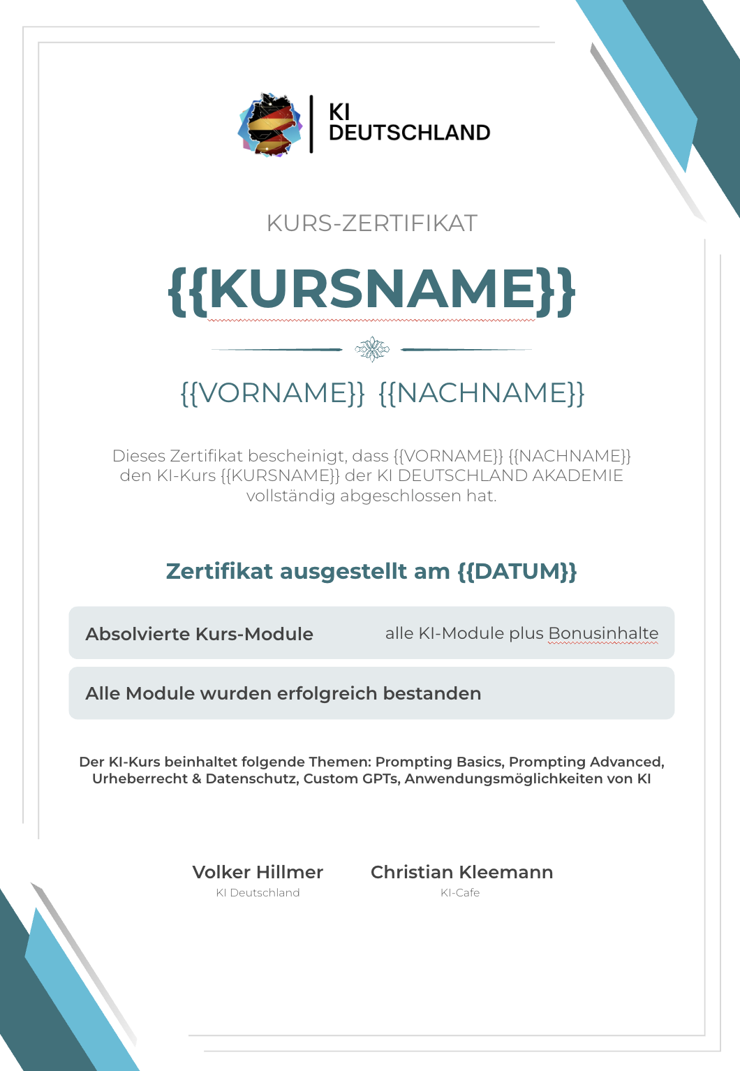 Du erhältst nach Abschluss deines Kurses ein KI Zertifikat von KI Deutschland.